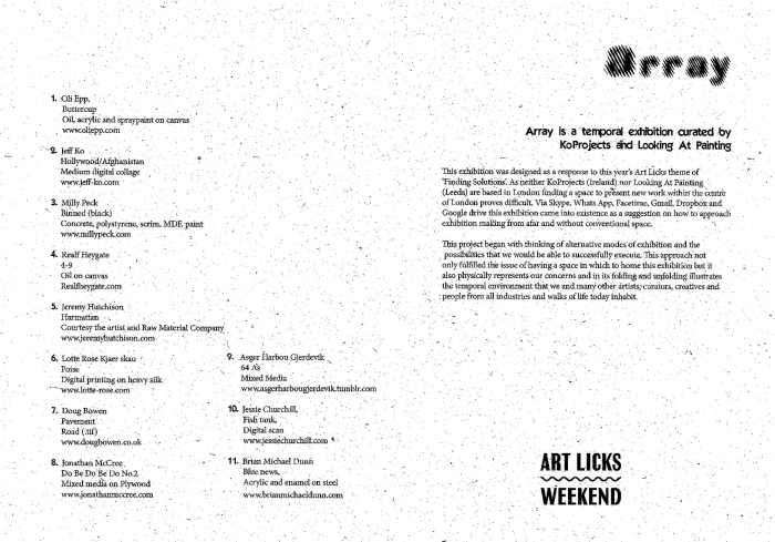 Array is a response to this year’s theme ‘Finding Solutions’ in relation to concerns about space and visibility for emerging artists and curators in today’s fluctuating landscape. Due to the nature and materiality of this project, the exhibition is transient and can both occupy space and disappear by the folding and unfolding of the fabric. The exhibition will become activated (unfolded) when approached by members of the public. Array presents 10 emerging artists whose work incorporates painting, sculpture and collage. In keeping with the tone of the exhibitions materiality, the works address ideas surrounding place, visibility and temporality.